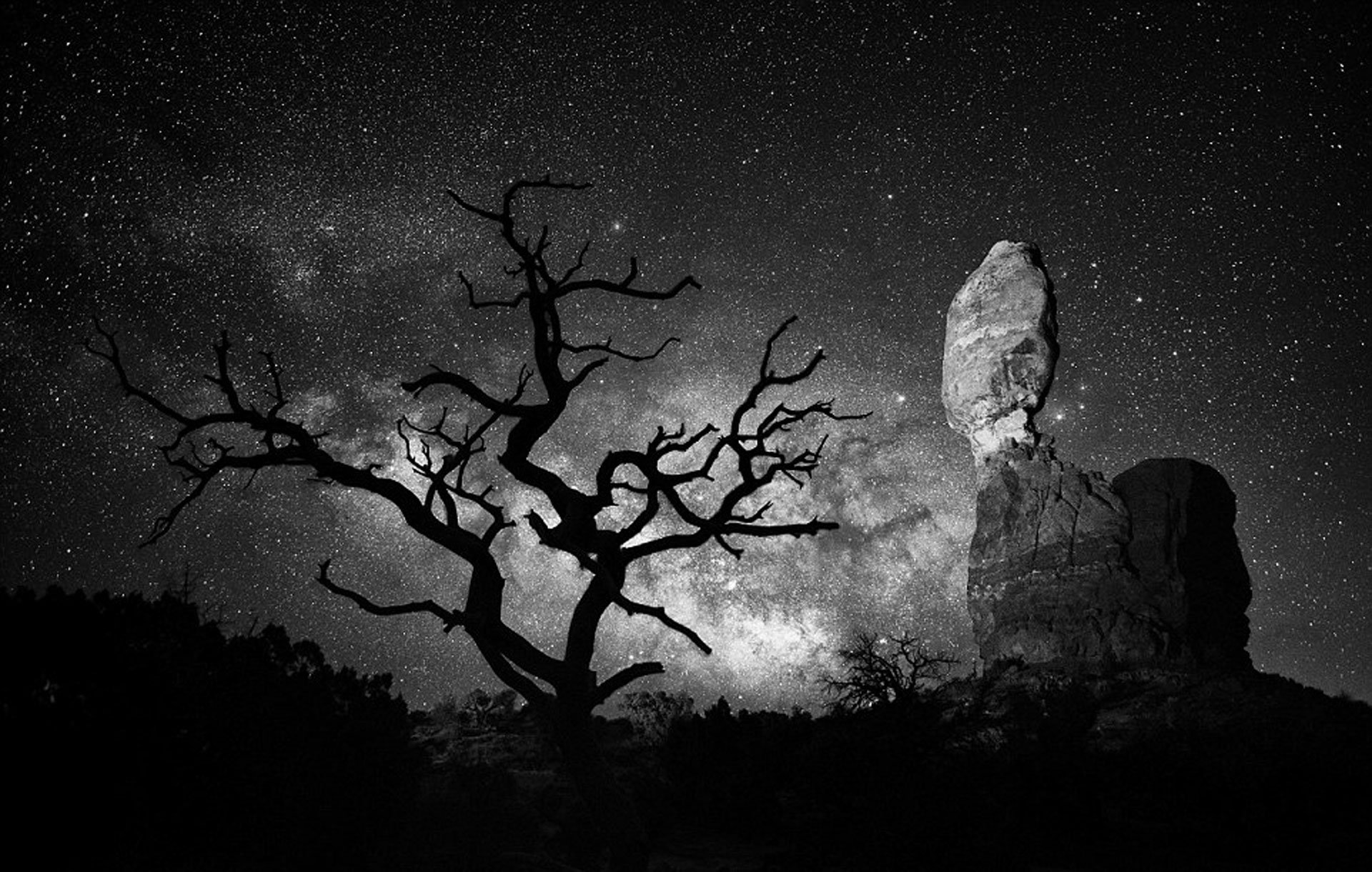 Arches National Park, Utah. La imagen muestra la piedra pendular y un árbol en soledad en plena noche. Manish Mamtani
