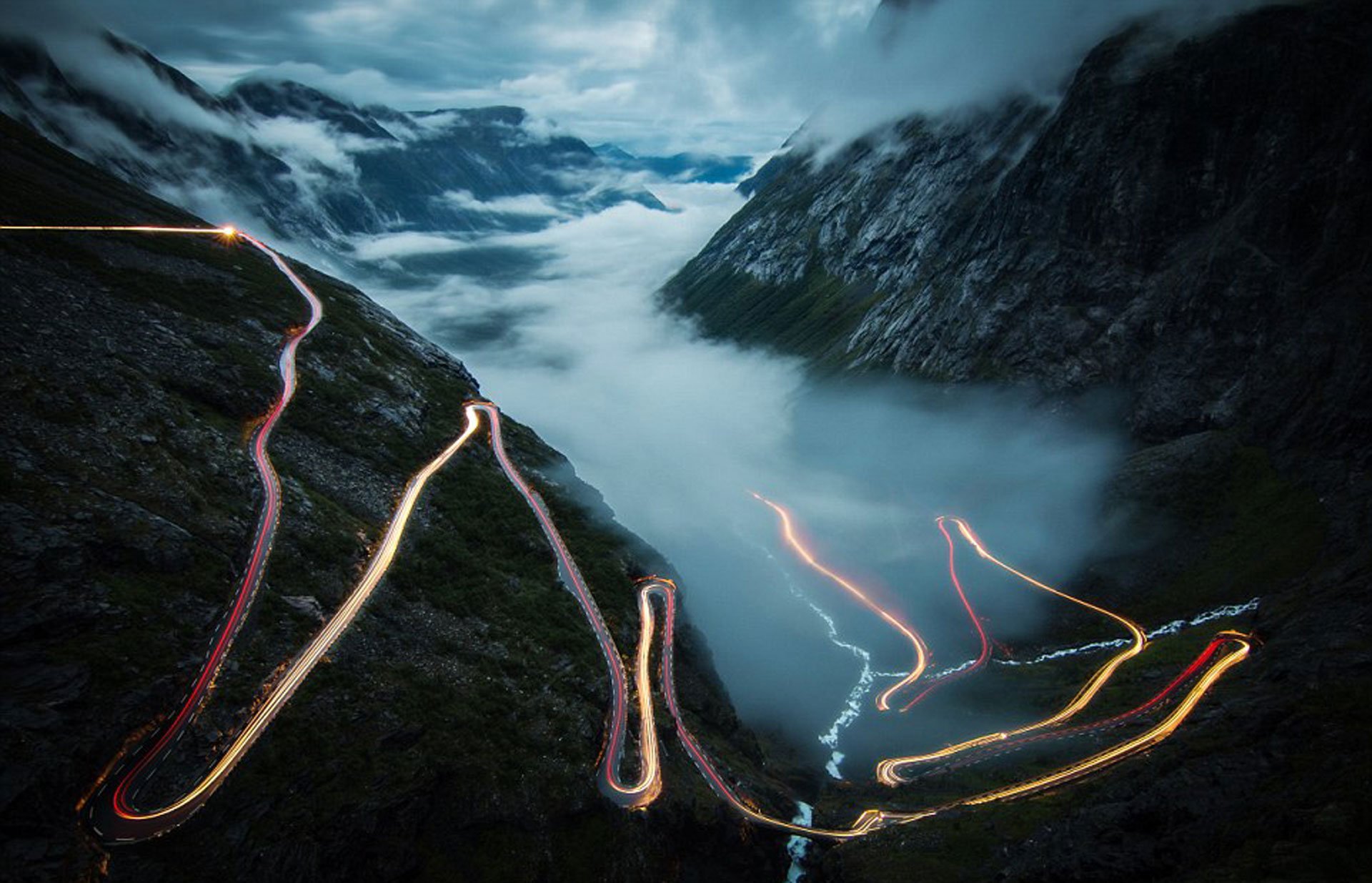 Una serpenteante carretera en Trollstigen, Noruega, muestra cómo los automóviles se pierden en la niebla. La imagen fue capturada por Christoph Schaarschmidt
