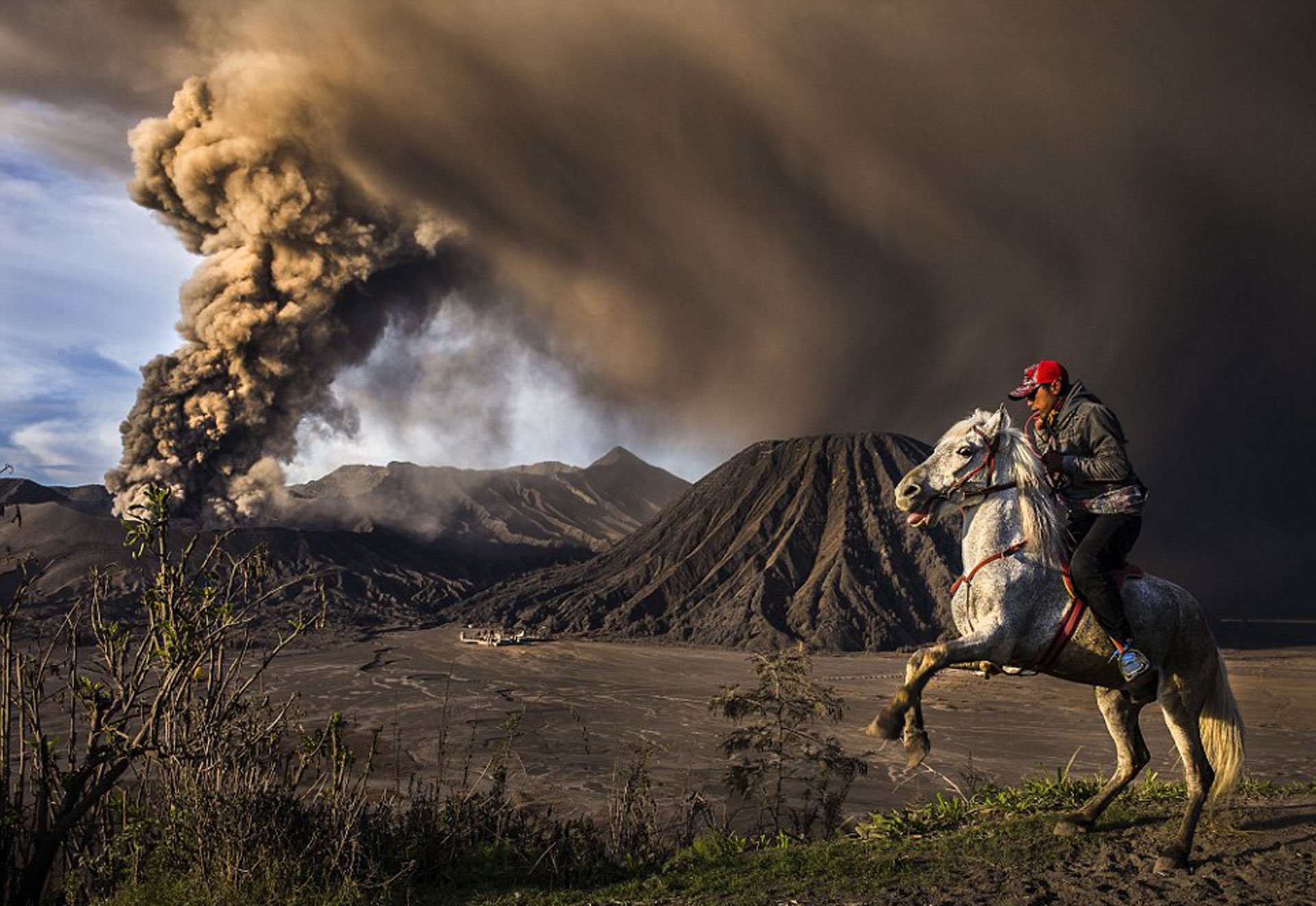 El fotógrafo Reynold Dewantara tomó esta escena dramática mientras un hombre a caballo presencia la erupción del Mount Bromo en Probolinggo, Java del Este, Indonesia