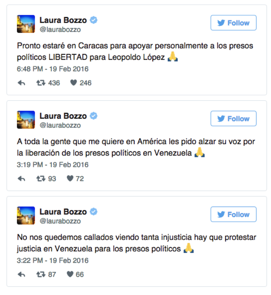 Este viernes en la tarde, la conductora peruana informó a través de su cuenta en Twitter @laurabozzo que pronto estará en la capital, para apoyar personalmente a los llamados presos políticos, especialmente al dirigente opositor Leopoldo López.