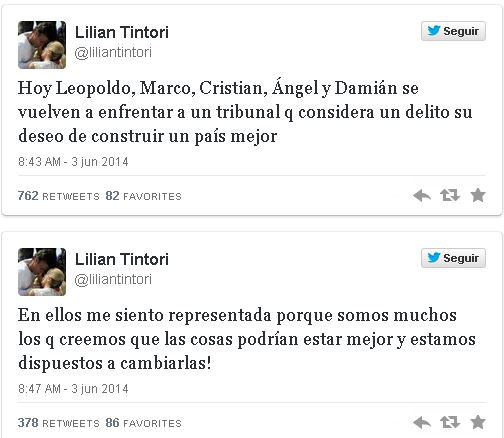 Lilian Tintori, esposa del coordinador de Voluntad Popular, Leopoldo López, escribió un tuit en su cuenta en la red social Twitter, diciendo que este martes López, Marco, Cristian, Ángel y Damián “se vuelven a enfrentar a un tribunal que considera un delito su deseo de construir un país mejor”.