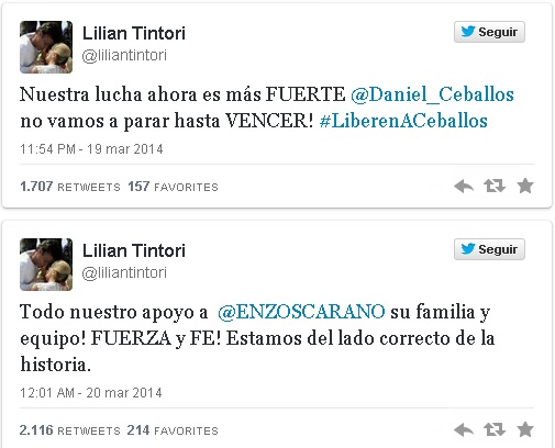 Lilian Tintori, esposa del dirigente de Voluntad Popula Leopoldo López, compartió este miércoles a través de las redes sociales, mensajes en apoyo al alcalde de San Cristóbal, Daniel Ceballos. Tintori mostró una fotografía de un rosario regalado por el alcalde tachirense, que resultó detenido por los presuntos delitos de rebelión civil y agavillamiento.