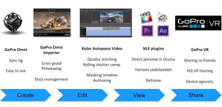 GoPro adquirió la compañía Kolor, desarrolladora entre otros de AutoPano, el software de cosido y edición de imágenes. Ahora han desarrolado un importador de contenidos 360 con posibilidades de edición básicas. Y para finalizar la compañía ofrece GoPro VR como plataforma donde compartir contenidos 360 con un sistema de códecs de broadcasting (Cineform 8k) asegurando, según sus palabras, evitar pérdida de calidad de otros estándares como es VP9 o H.264 usados por YouTube y Facebook.