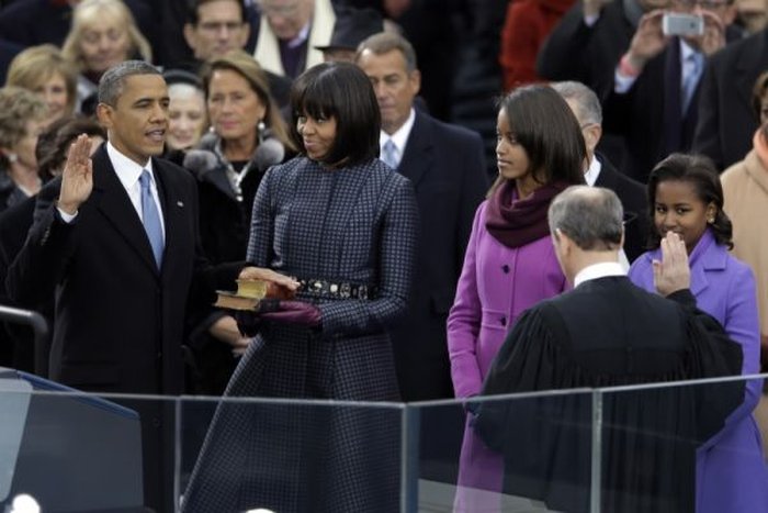 Michelle Obama (2013) luciendo un traje del diseñador norteamericano Thom Browne