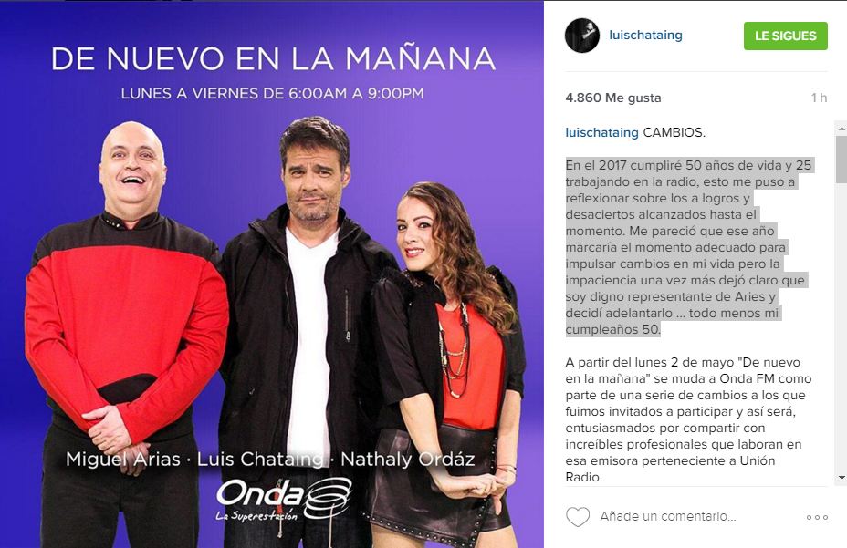 “A partir del lunes 2 de mayo «De nuevo en la mañana» se muda a Onda FM como parte de una serie de cambios a los que fuimos invitados a participar y así será, entusiasmados por compartir con increíbles profesionales que laboran en esa emisora perteneciente a Unión Radio”, escribió en su cuenta en Instagram.