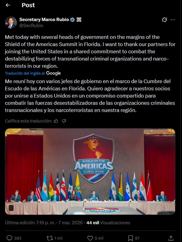 Diplomacia en español y estrategia conjunta Rubio, quien se dirigió a los jefes de Estado en español, destacó que la iniciativa no solo busca blindar las fronteras frente al crimen organizado, sino también neutralizar la influencia extranjera hostil. La cumbre se centró en tres pilares estratégicos: