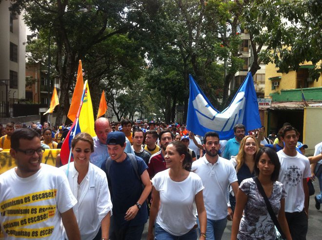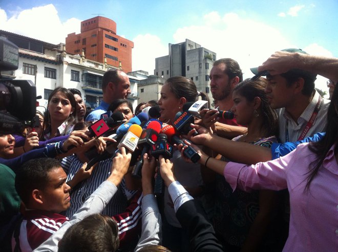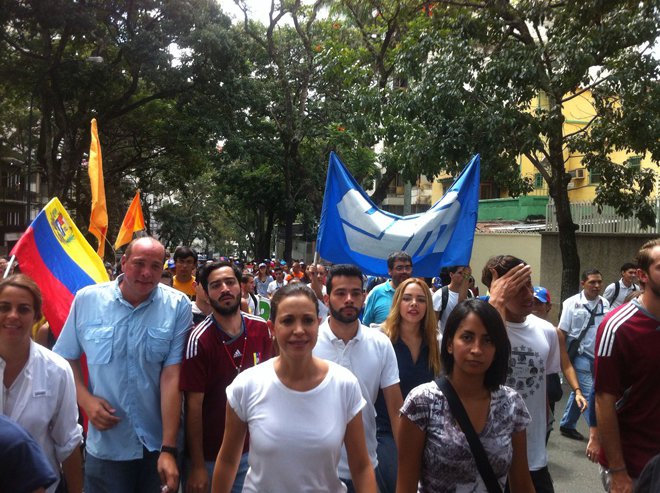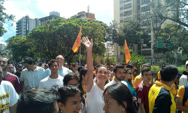 La coordinadora nacional de Vente Venezuela, María Corina Machado, acompañó este jueves a los estudiantes que marcharon hasta la sede de la Nunciatura Apostólica en Caracas para hacer entrega de un documento. Desde allí, aseguró que “Venezuela requiere que presionemos y conquistemos la libertad. Al régimen primero lo derrotamos en la calle”.