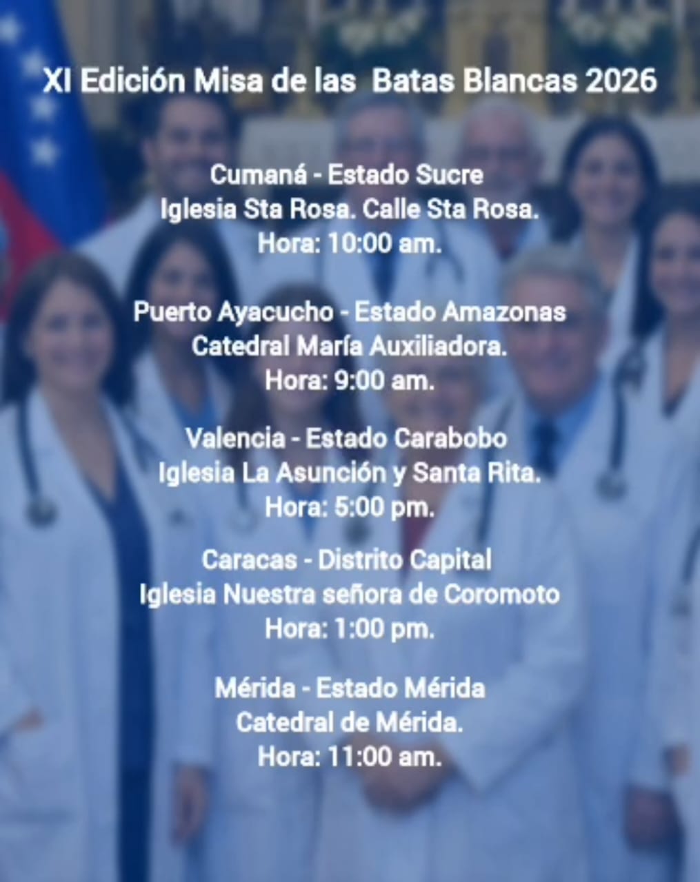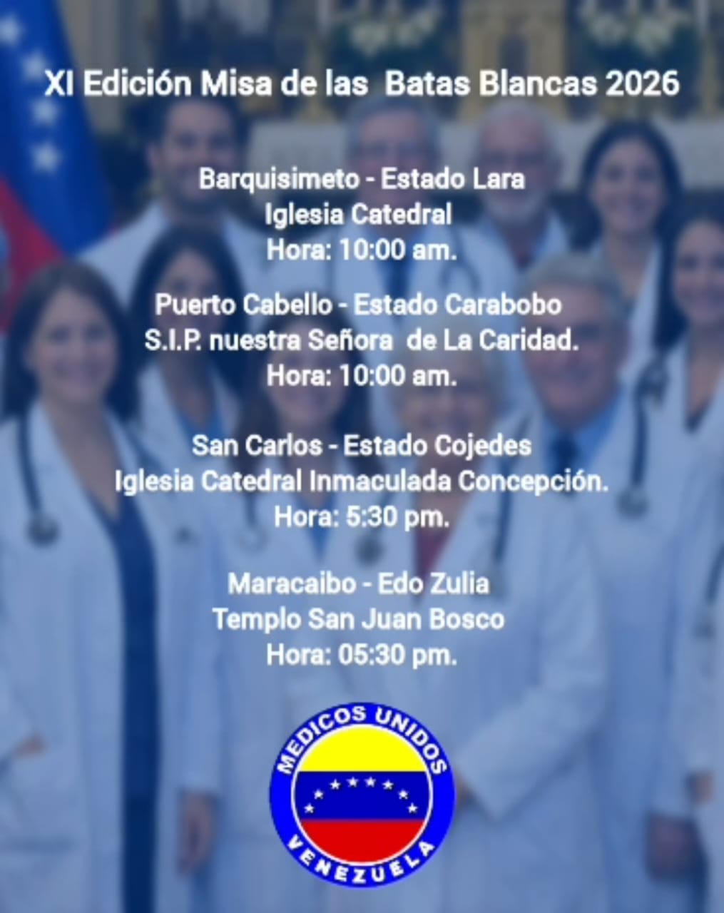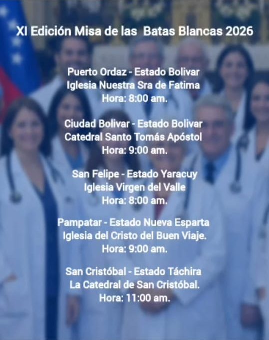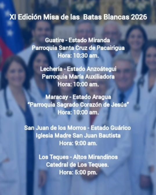 La organización Médicos Unidos de Venezuela tiene el honor de invitar a todos los profesionales del sector salud, gremios aliados y a la sociedad civil a participar en la XI Edición de la Misa de las Batas Blancas, una jornada de fe y fraternidad que se celebrará simultáneamente en las principales iglesias del territorio nacional el domingo 8 de marzo.