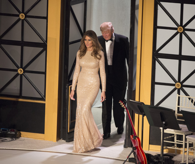 Para la llamada ‘Candlelight Dinner’, la firma elegida por Melania Trump fue Reem Acra, una diseñadora libanesa especializada en vestir a las grandes celebrities para desfilar por la alfombra roja. En este caso, el vestido elegido era un diseño de manga larga, con cuello a la caja y ceñido al cuerpo confeccionado con lentejuelas en color champán. No se excedió en la elección de complementos, puesto que el vestido brillaba, de por sí, con luz propia.