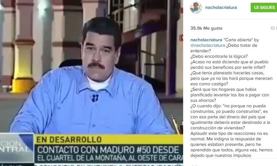 Es por ello que Nacho decidió escribirle una carta en la que además de dejar un mensaje al mandatario, invitó a los venezolanos a que reflexionaran sobre lo que está pasando en el país.