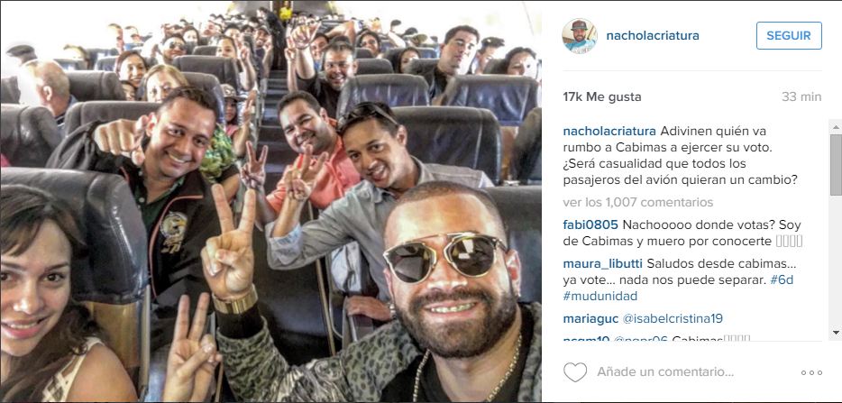 «Adivinen quién va rumbo a Cabimas a ejercer su voto. ¿Será casualidad que todos los pasajeros del avión quieran un cambio?». expresó en su cuenta de instagram, junto a una imagen en la cual se ve en el avión posando con el resto de los tripulantes de la nave.
