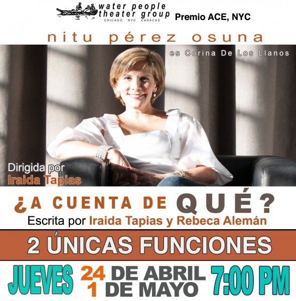 “¿A CUENTA DE QUÉ?” monólogo escrito por Rebeca Alemán e Iraida Tapias, quien también la dirige y con el cual Nitu Pérez Osuna se sube al escenario, para interpretar un personaje que conmueve y divierte al público, en tiempos en que la esperanza y el buen humor son imprescindibles.