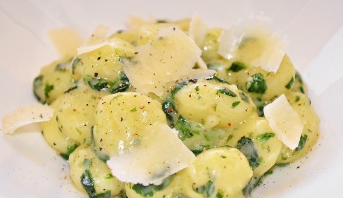 Tomad nota de esta receta de Ñoquis con salsa cremosa de espinacas y queso porque la podéis preparar en menos de 20 minutos, claro, una vez que tengáis preparados los ñoquis (la masa), aunque siempre está la opción de utilizar unos buenos ñoquis comerciales. Si queréis enriquecer aún más la salsa, y el plato en general, podéis añadir unos taquitos de bacon o jamón salteados, y también unos piñones. Esperamos que os gusten.