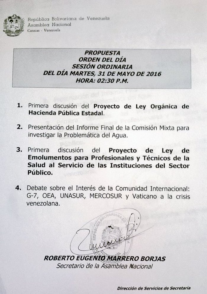 De igual manera, los diputados realizarán un debate sobre el interés de la Comunidad Internacional: G-7, OEA, Unasur, Mercosur, y Vaticano a la crisis venezolana.