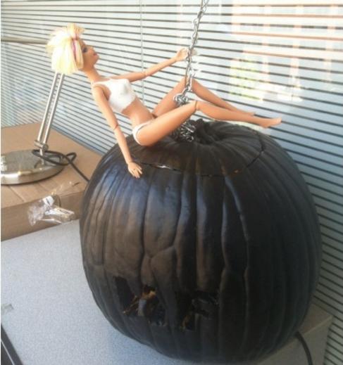 Puedes darle un toque mainstream, darle vida a la cultura popular, de forma sencilla y divertida. Seguro sorprendes a todos con esta idea de convertir tu calabaza en una Wrecking Ball de Miley Cyrus. Un poco de pintura negra, o gris oscura, una cadena y una Barbie a la que le puedas cortar el cabello y listo.