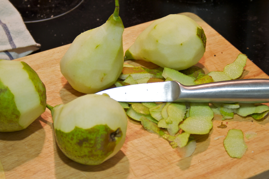 Lo primero será pelar las peras y quitarles la piel, lavándolas bien después. Tenéis que poner todos los ingredientes menos el hojaldre en una cazuela y hervir durante aproximadamente 30 minutos, dependerá un poco de lo duras que estén las peras, tener cuidado con las peras de agua que con 15 minutos estarán listas.