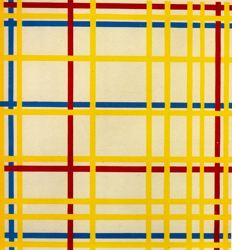 La aplicación de sus teorías le condujo a realizar obras como Composición en rojo, amarillo y azul (1921, Gemeentemuseum), en la que la pintura, compuesta sólo por unas cuantas líneas y algunos bloques de color bien equilibrados, crea un efecto monumental a pesar de la escasez de los medios, voluntariamente limitados, que emplea. Cuando se trasladó a Nueva York en 1940, su estilo había logrado una mayor libertad y un ritmo más vivo. Abandonó la severidad de las líneas en negro para yuxtaponer áreas de colores brillantes, como puede verse claramente en la última obra que dejó acabada, Broadway Boogie-Woogie (1942-1943, Museo de Arte Moderno, Nueva York, MOMA).