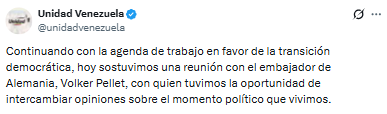 Este miércoles 11 de febrero, la Plataforma Unitaria Democrática (PUD) sostuvo una reunión estratégica con el embajador de Alemania en Venezuela, Volker Pellet, con el objetivo de analizar la evolución del panorama político nacional.