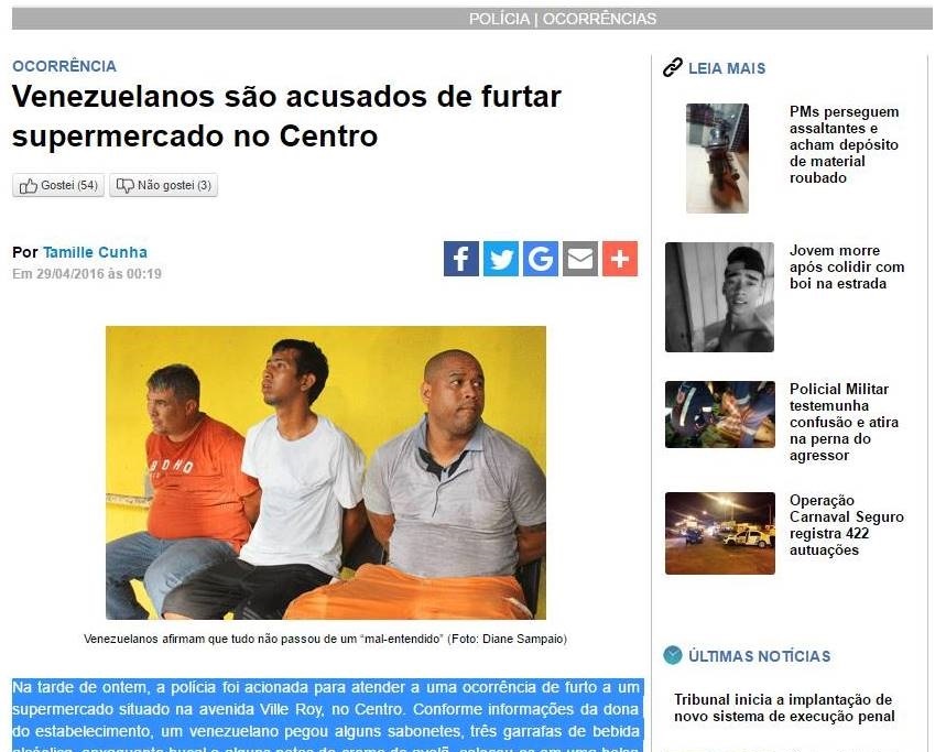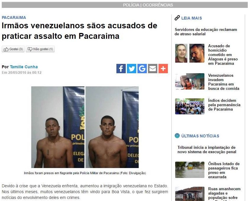 Con el título Hermanos venezolanos son acusados de practicar asalto en Pacaraima, el diario cuenta en un artículo del 20 de mayo que los venezolanos no solo van por alimentos a Brasil, sino también se ven incursos en delitos.