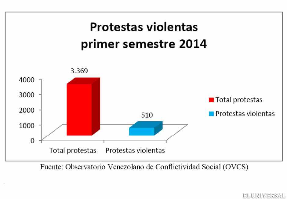 6.369 protestas, equivalente a 35 diarias en todo el país, es el saldo de las movilizaciones registradas en Venezuela en el primer semestre de 2014, lo que representa un aumento de 278% en este período con relación al mismo período durante 2013, cuando se registraron 1.687 protestas pacíficas. Estas son las conclusiones que presenta el Observatorio Venezolano de Conflictividad Social (OVCS) en su más reciente informe.