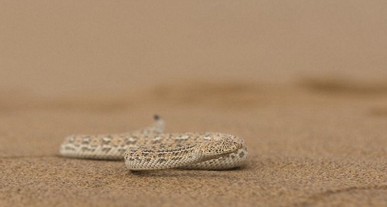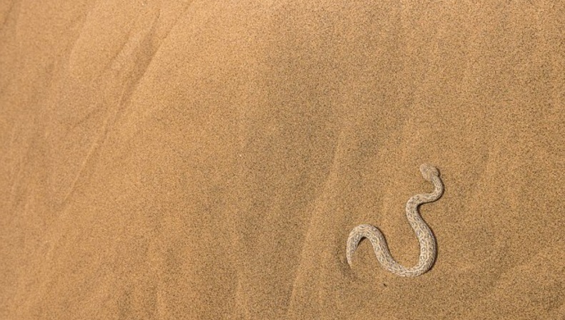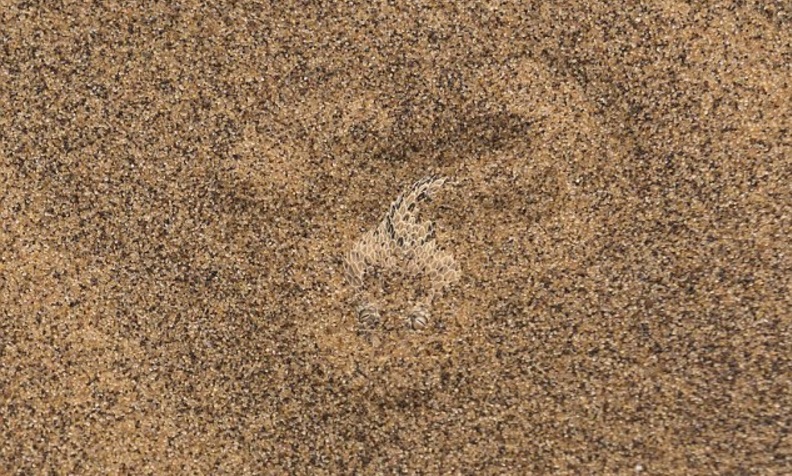 El fotógrafo Wim van den Heever, no sólo tuvo la fortuna de ver a la serpiente, también logró capturar el espectacular camuflaje. “Estas serpientes se quedan bajo la arena tratando de atrapar lagartijas y lagartos. Además es parte del mecanismo de su defensa, no tendría sentido para la serpiente tratar de alejarse en un entorno abierto y ser descubierta”, explica Win Van.