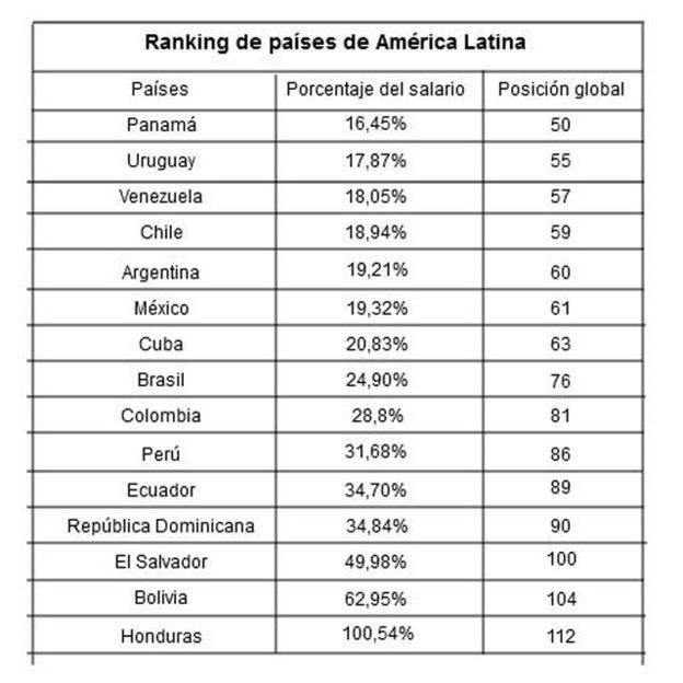 Uruguay, Venezuela, Chile, Argentina, México y Cuba le siguen en ese orden: requieren entre el 10 y el 20% del salario medio.