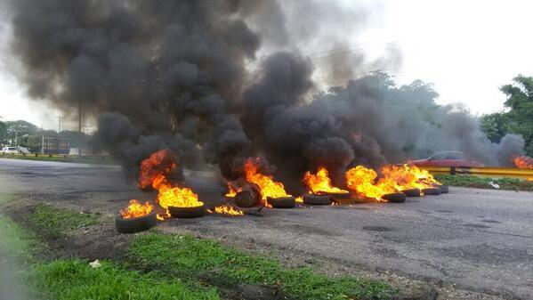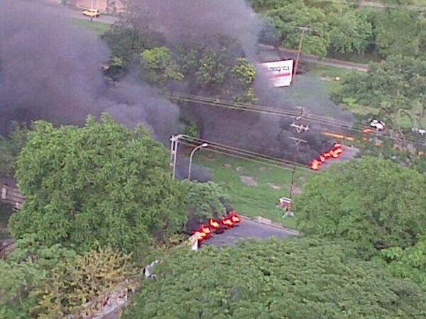 Varios cauchos quemados interrumpen desde tempranas horas de la mañana de este martes el paso por la Autopista del Este, espcíficamente a la altura del C.C Sambil, en la urbanización Palma Real, Mañongo.