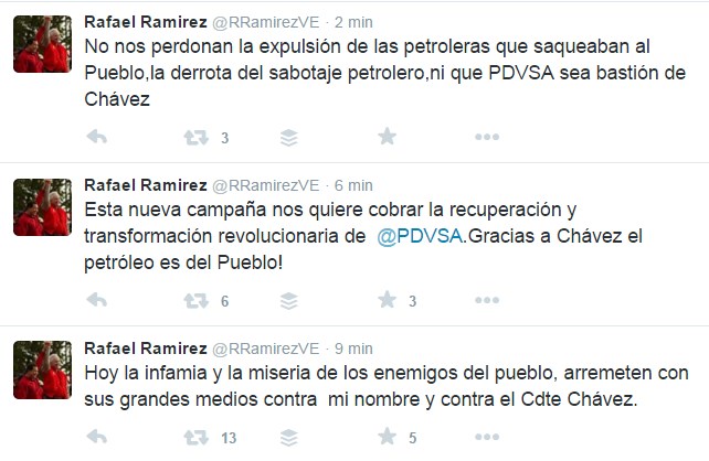 Calificó de “infamia” y “miseria” los ataques en su contra por parte de los grandes medios. “Esta nueva campaña nos quiere cobrar la recuperación y transformación revolucionaria de Pdvsa. Gracias a Chávez el petróleo es del Pueblo!”, dijo.