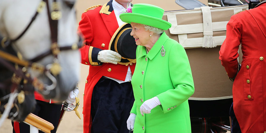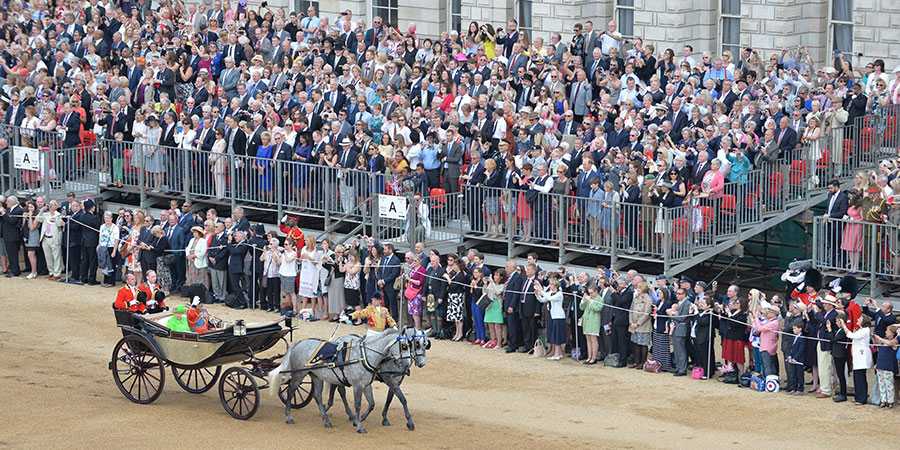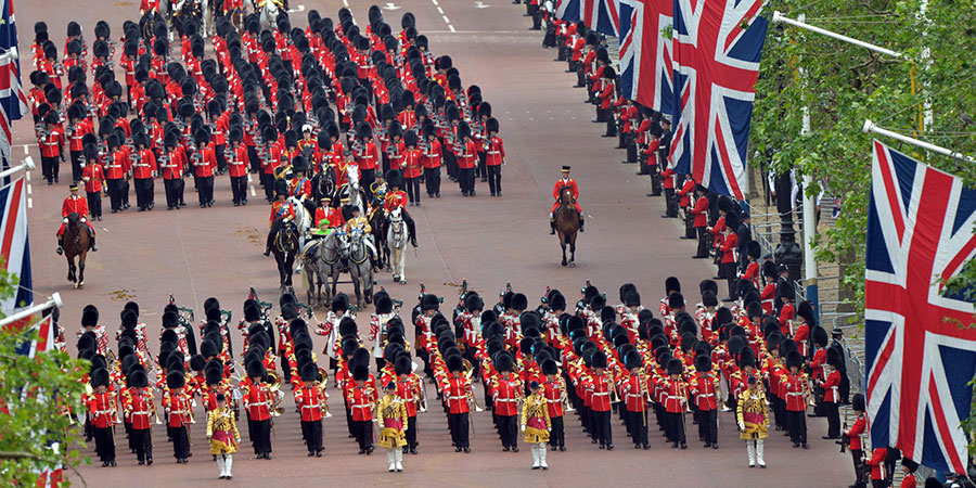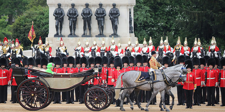 Unos 1.500 soldados de uniforme de parada y 300 caballos desfilaron en esta ceremonia llamada «Trooping the colour» («Desfile de estandartes»), que tiene su origen en los antiguos preparativos para la guerra, cuando se exhibían todas las banderas del ejército para que los soldados las reconocieran en el fragor de la batalla.