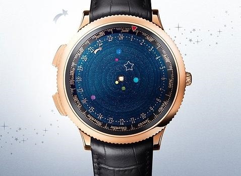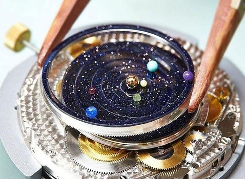 El reloj de oro rosa consta de 396 piezas diminutas y cuenta con una réplica en miniatura de nuestro sistema solar, integrando el Sol, una estrella fugaz y seis planetas enjoyados, pues cada planeta está representado por una piedra preciosa o semipreciosa. Mercurio está hecho de serpentina; Venus, de cloromelanita. Marte, tan de moda en la actualidad, de jaspe rojo; Júpiter, de ágata azul; Saturno, de sugilita. Y, por último, la Tierra, representada con un hermoso color turquesa.