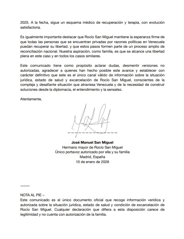 José Manuel San Miguel, hermano mayor y único portavoz autorizado de la activista Rocío San Miguel, emitió este sábado 10 de enero de 2026 un comunicado oficial para esclarecer la situación jurídica y el estado de salud de su hermana, tras su excarcelación ocurrida el pasado 8 de enero.
