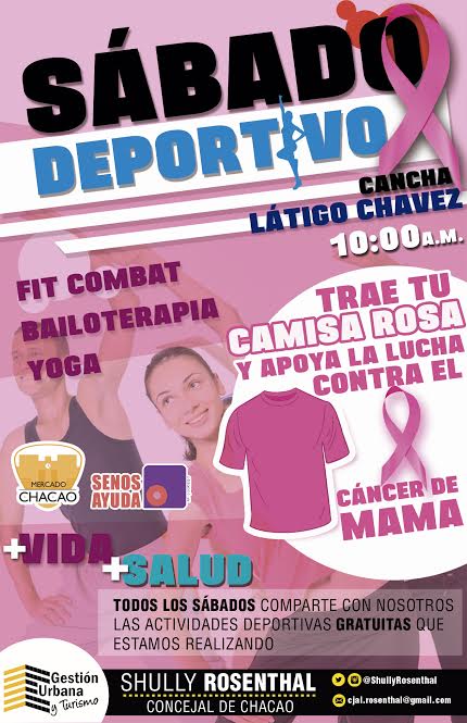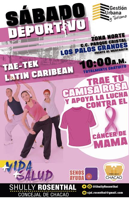 Trae tu prenda de color rosa y únete a la Lucha Contra el Cáncer de Mama Haciendo Deporte Haciendo Ciudad, la cita es en nuestras actividades deportivas simultaneas que se están realizando en la Cancha Látigo Chavez (Chacao) y en la Zona Norte de Los Palos Grandes, C.C. Parque Cristal (frente al mercadito), a las 10:00 AM.