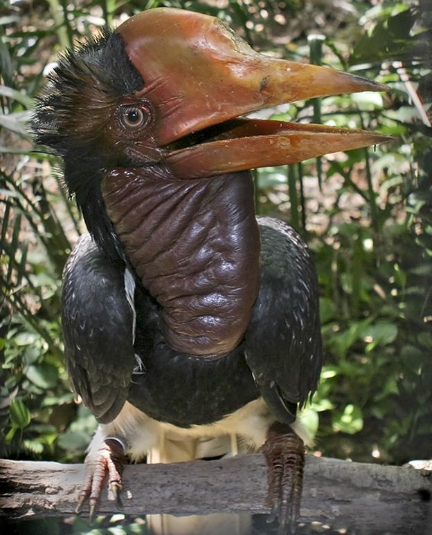 En otras especies de bucerótidos -hay más de 60 en África y Asia- el casco es hueco, pero en ésta es sólido. El macho lo usa para combatir con otros machos, y ambos sexos lo emplean como una herramienta para extraer insectos de los árboles podridos.