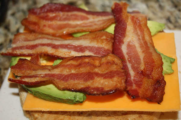 Coloque las rodajas de pan sobre una superficie de trabajo limpia y cubra con el queso cheddar, dividiendo de manera uniforme. Coloque las rebanadas de aguacate en la parte superior del cheddar y las rodajas de tocino. Luego cubra con el queso paisa, dividiendo de manera uniforme.