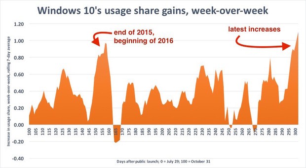 Otra de las razones por las que se habría incrementado esta tasa de actualización estaría relacionada con las estrategias llevadas por la compañía. Recientemente a algún usuario le ha aparecido una ventana de actualización a Windows 10 que no podía cerrarse, mientras que otros han visto como, de la noche a la mañana, han contado con un sistema operativo nuevo al no deshabilitar las actualizaciones automáticas.