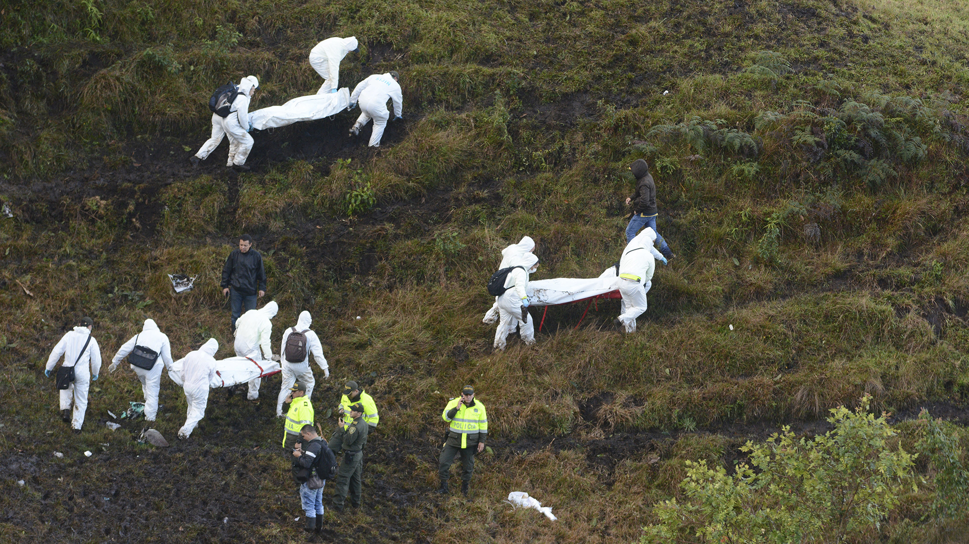 En la imagen pueden observarse a personal del equipo de rescate y forenses recolectando los cuerpos sin vida de los pasajeros del vuelo de LAMIA, la aerolínea que transportó desde Brasil a los futbolistas.