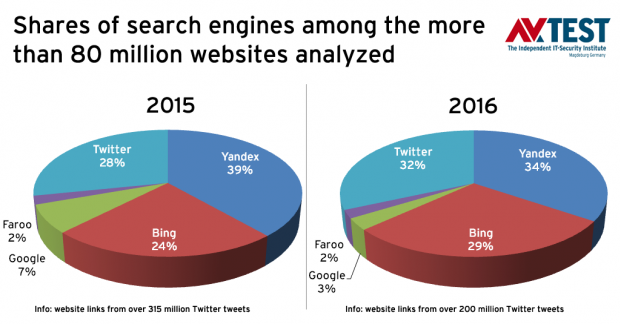 La firma de investigación AV-TEST ha emitido un informe donde se recogen los resultados tras analizar 80 millones de enlaces encontrados en resultados de búsqueda en Internet en 2015, y otros 81 millones de enlaces estudiados en 2016. De todos estos sitios, han identificado a 18.280 webs en 2015 y 29.632 páginas en 2016 con algún tipo de enlace malicioso, algo que choca con hace tres años cuando de 40 millones de páginas solo encontraron 5.060 sitios con enlaces infectados.