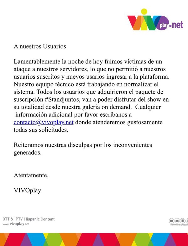 Lamentablemente, según lo publica la empresa VivoPlay a través de sus redes sociales en un comunicado, el streaming se vio cancelado debido a un ataque a su servidor que dejó a mucha gente sin poder disfrutar del espectáculo en su totalidad.