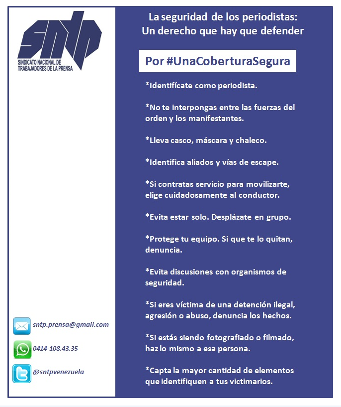 El Sindicato Nacional de Trabajadores de la Prensa (SNTP), visto el aumento de violaciones a la libertad de expresión y de agresiones personales contra periodistas durante la cobertura de manifestaciones de calle, exhortó a sus afiliados -y a quienes vayan a ejercer labores de reporterismo este miércoles 26 de octubre- a asumir una actitud preventiva ante posibles situaciones de vulnerabilidad.
