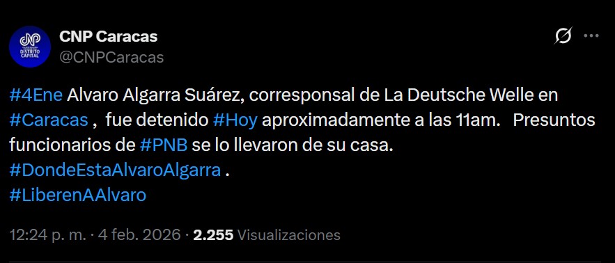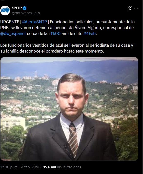 El Sindicato Nacional de los Trabajadores de la Prensa (SNTO) y el Colegio Nacional de Periodistas (CNP) denunciaron a través de sus cuentas en X la detención del periodista Álvaro Algarra Suárez, corresponsal de la cadena internacional alemana Deutsche Welle (DW) en Caracas.