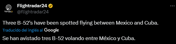 «Se han avistado tres B-52 volando entre México y Cuba», fue el mensaje de FlightRadar24. Previamente, los bombarderos estaban estacionados en la Base Aérea de Barksdale, en Luisiana.