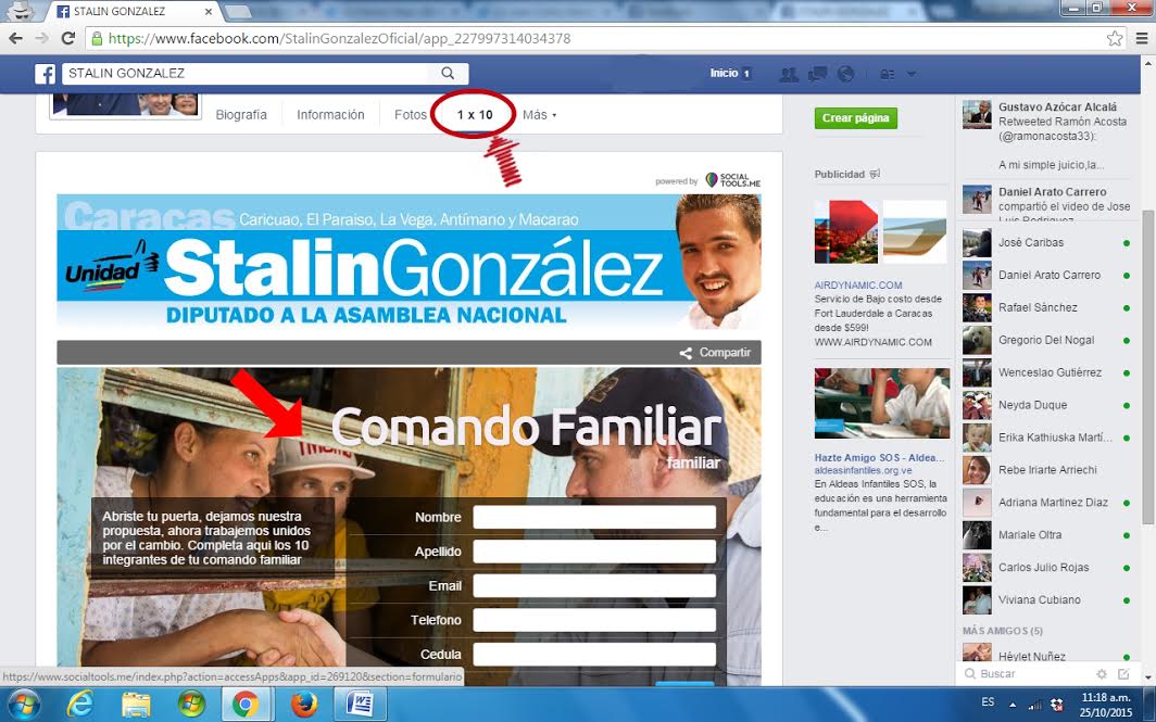 “Solo tienes que seguir unos cuantos pasos sencillos una vez iniciada tu sesión en Facebook. Ubica mi Fan Page, luego de darle ‘Me Gusta’, a tu mano derecha en la pantalla encontraras una casilla identificada como ‘1×10’, al hacer click allí se desplegará el Formulario donde podrás llenar tus datos personales y también los de tu Comando familiar que voten en el Circuito; y listo, automáticamente quedan registrados”.
