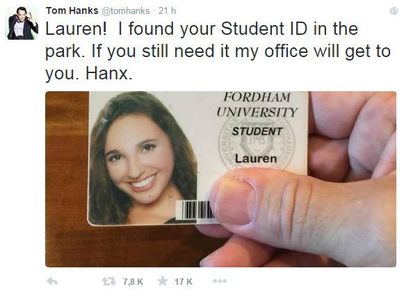 Si su nombre es Lauren, el actor Tom Hanks la está buscando, pero solo si ha perdido su carnet de estudiante.