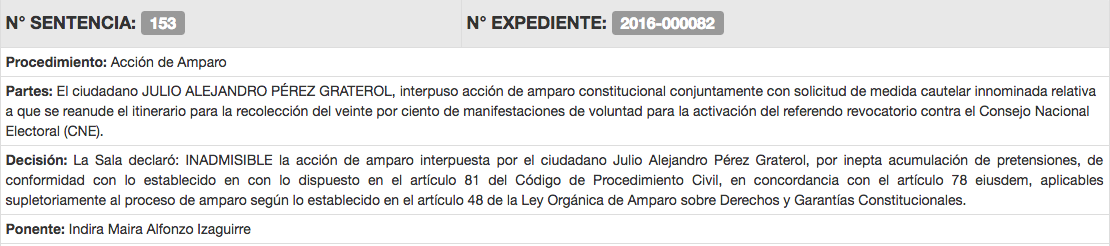 La Sala Electoral del Tribunal Supremo de Justicia (TSJ), declaró inadmisible un amparo interpuesto por el abogado Julio Alejandro Pérez Graterol, para reanudar la recolección del 20% que busca la activación del referéndum revocatorio contra el presidente Nicolás Maduro.