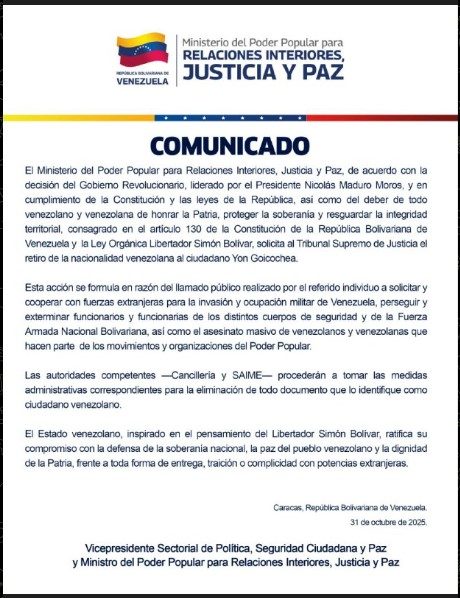 El Ministerio del Poder Popular para Relaciones Interiores, Justicia y Paz, ha solicitado al Tribunal Supremo de Justicia (TSJ) retirar la nacionalidad venezolana al dirigente de extrema derecha, Yon Goicoechea, por solicitar y cooperar con fuerzas extranjeras para una invasión en la nación bolivariana.