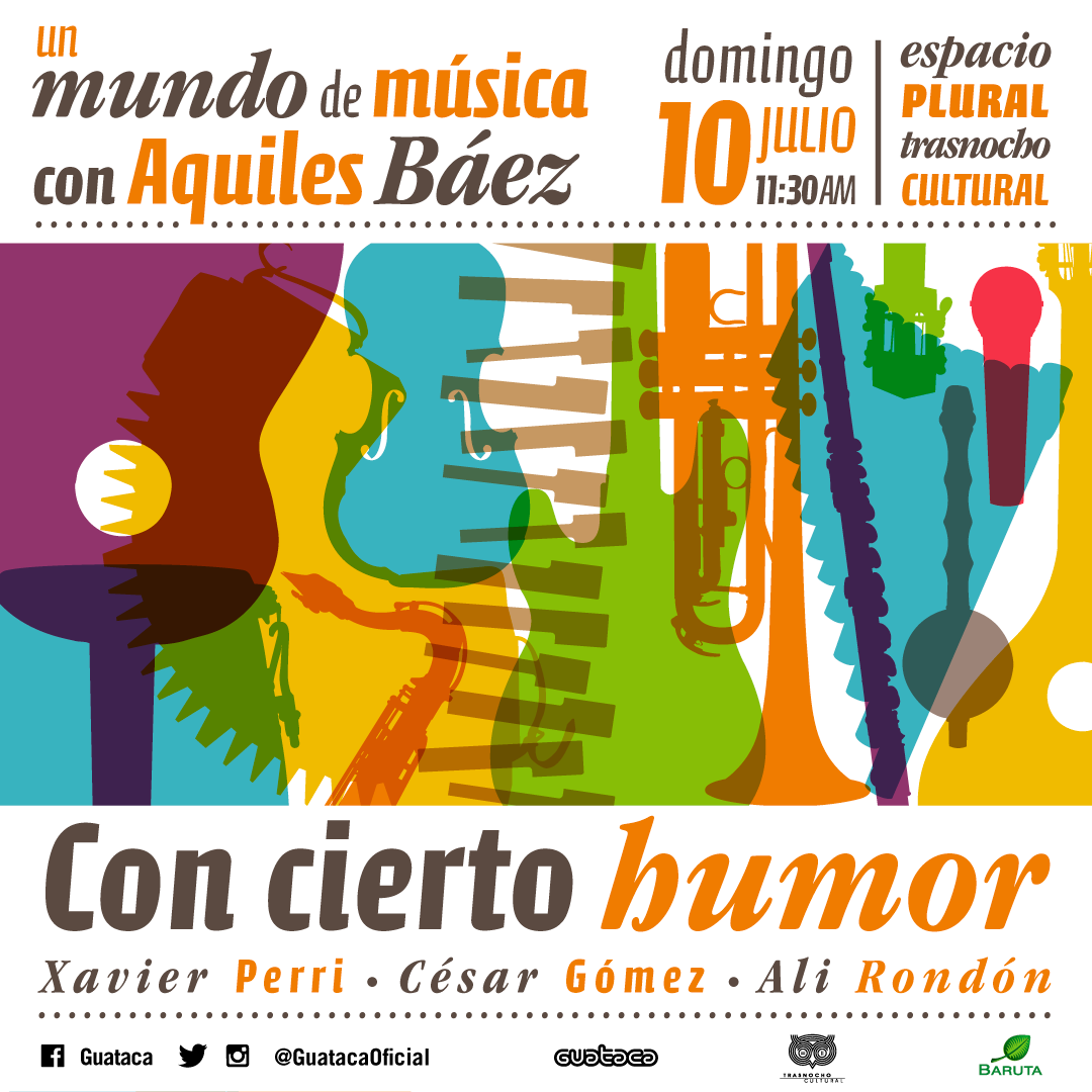 Tras el éxito indiscutible de Una guitarreada tanguera y Ceviche Musical Peruano, el domingo 10 de julio a las 11:30 am, el ciclo musical Un mundo de música continúa en el Espacio Plural del Trasnocho Cultural. Aquiles Báez y su peculiar sentido del humor, esta vez nos invita a compartir Con cierto humor, un concierto avocado a la risa y el sano esparcimiento a través de la música que retratará en un solo escenario virtuosísimo, genialidad y buen humor, que arrancarán las más apasionadas carcajadas del espectador.