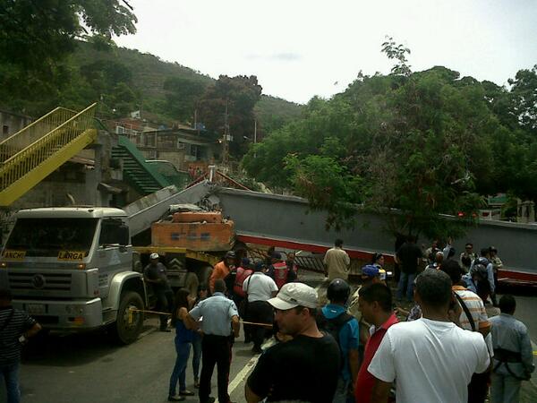 La pasarela ubicada en la avenida Fernando Figueredo entre la Cedeño y Lara a la altura del sector El Calvario, colapsó cerca del mediodía de este martes, luego de que una grua -que transportaba una retroexcavadora- sobrepasara la altura del sistema peatonal.