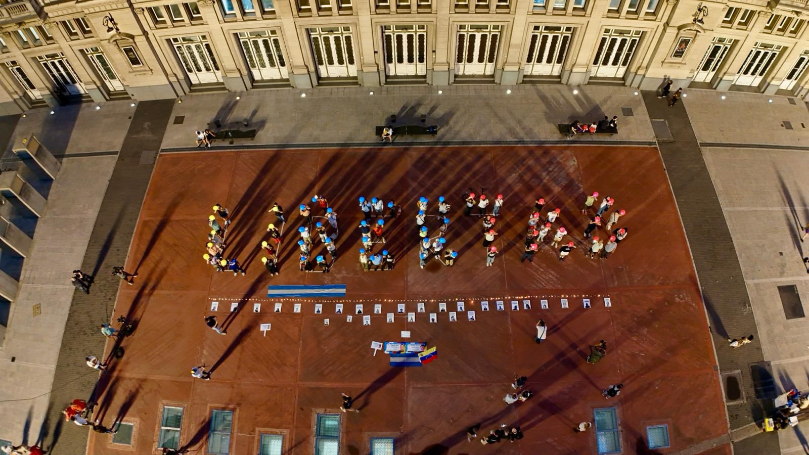 Decenas de venezolanos se reunieron este martes 3 de febrero en la Plaza Vaticano, junto al Teatro Colón de Buenos Aires, para exigir la liberación de todos los presos políticos que permanecen detenidos arbitrariamente en Venezuela. Con globos y luces formaron una gigantesca palabra «LIBERTAD», en una vigilia que coincidió con el primer mes de la captura y extracción de Nicolás Maduro.