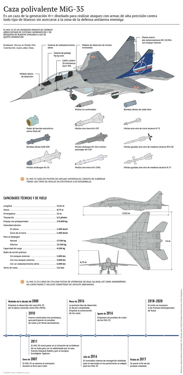 «Gracias a Dios, actualmente no hay conflictos armados de gran envergadura, hay sólo locales, como el de Siria. Necesitamos aviones que precisamente puedan cumplir esa tarea, y los 3.500 kilómetros que puede volar el Mig-35 nos vienen muy bien», dijo Bóndarev.