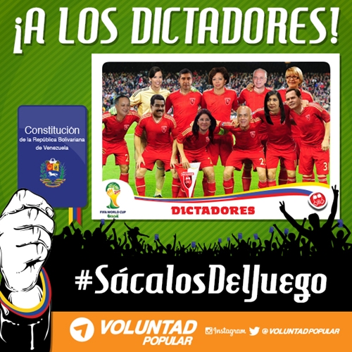 El lanzamiento de la campaña se realizó en Twitter, Facebook e Instagram durante el inicio del Mundial de Fútbol Brasil 2014 bajo los hashtags #SácalosDelJuego #MundialBrasil2014 y #VzlaConElMundial. En las imágenes se aprecia a Cilia Flores como capitana del equipo “Dictadores FC (Fidel Castro)” acompañada por los principales personeros del Partido Socialista Unido de Venezuela, quienes ocupan los diversos ministerios del régimen, así como las cabezas de los Poderes Públicos y alguna gobernación y alcaldía.